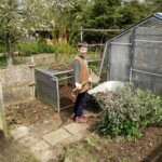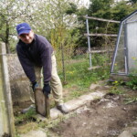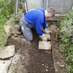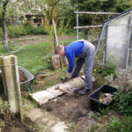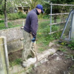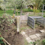 Der Umbau des Komposthaufen zu einem Drei-Felder-Komposthaufen erforderte das Demontieren des Frühbeetes und das Verlegen von neuen Steinplatten auf dessen Standort. Des Weiteren musste ein Pfahl für die Halterung der Rückwand des zweiten Komposthaufens gesetzt werden und zum Schluss noch der Gitterrost-Komposthaufen, als dritter Komposthaufen, sowie rechte Seitenwand des zweiten Komposthaufens umgesetzt werden.